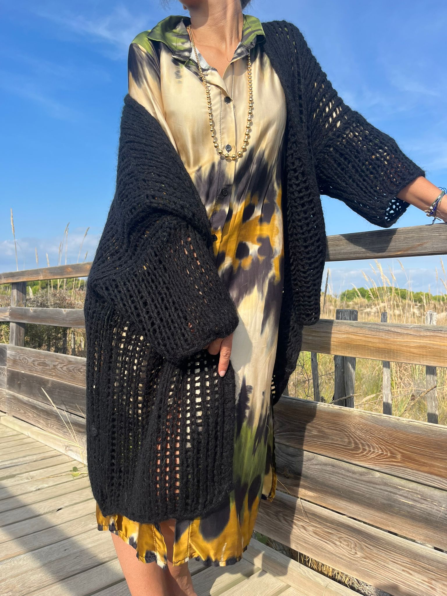 Un gilet en grosse maille, long et tellement réconfortant, dans sa version noire. Une pièce qui agrémentera aussi bien vos pantalons que vos robes, pour un style définitivement bohème!