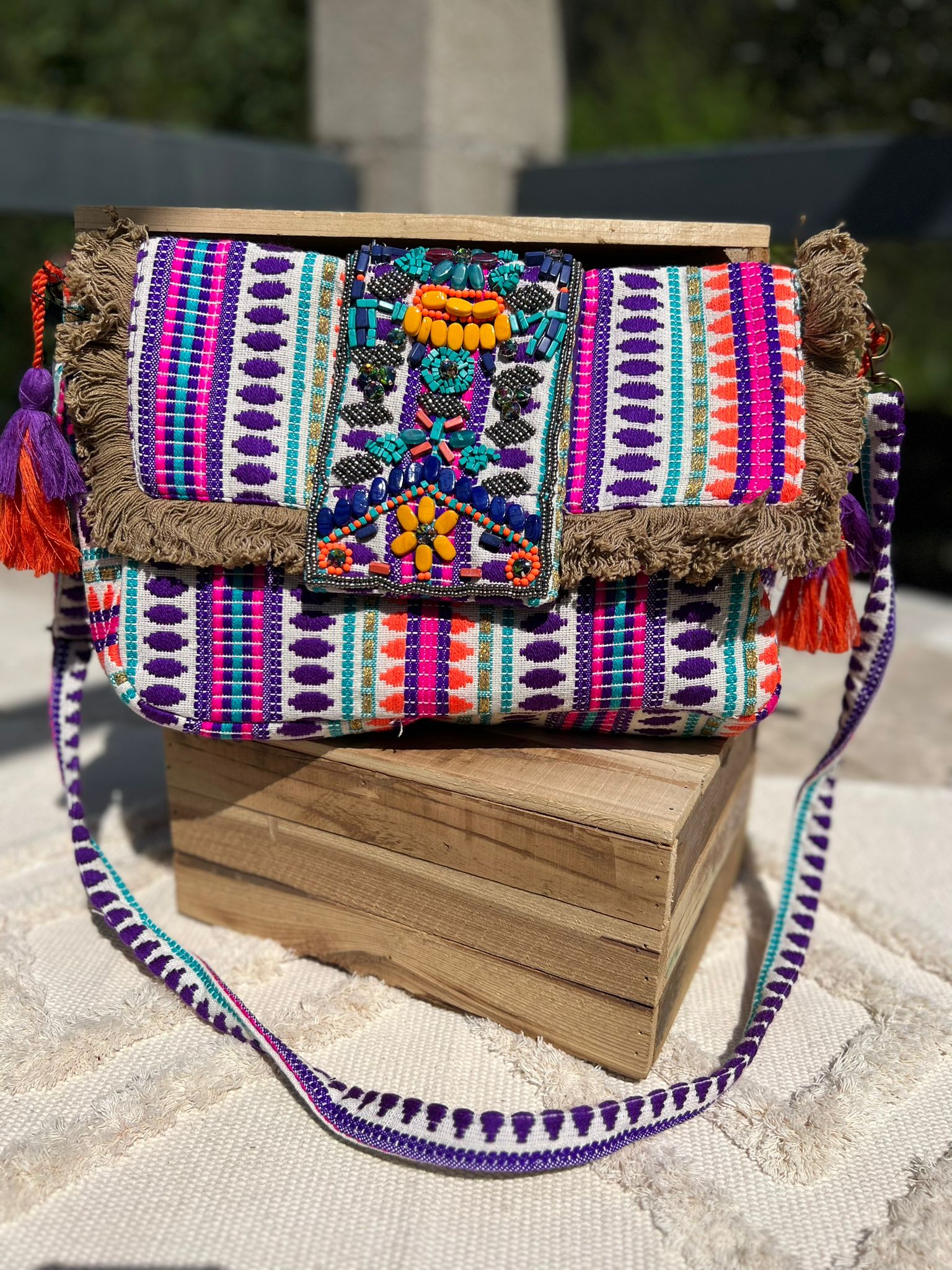 Découvrez ce sac violet 100% boho, avec ses broderies, ses perles et ses franges! Une touche bohème pour rehausser vos looks les plus minimalistes!